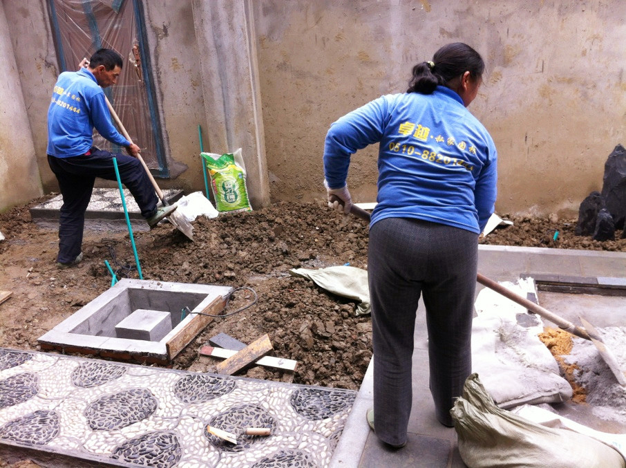 工人们正在整理场地,准备铺设汀步,做竹滴水