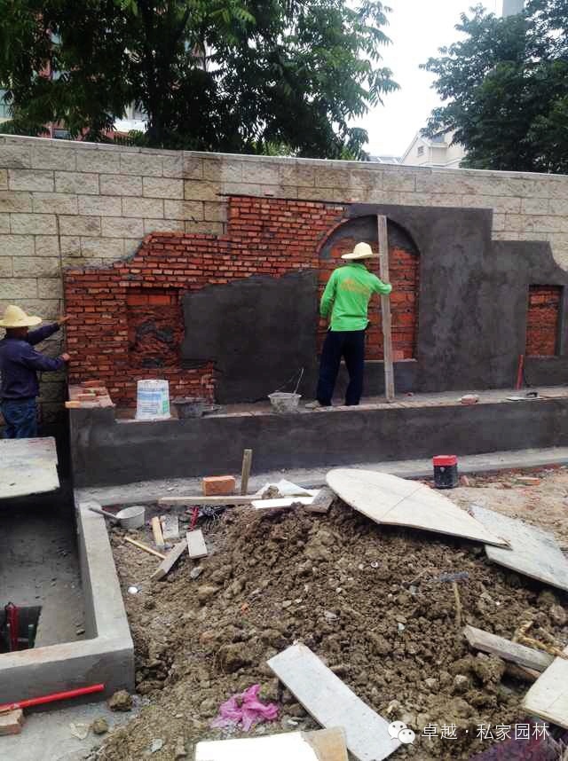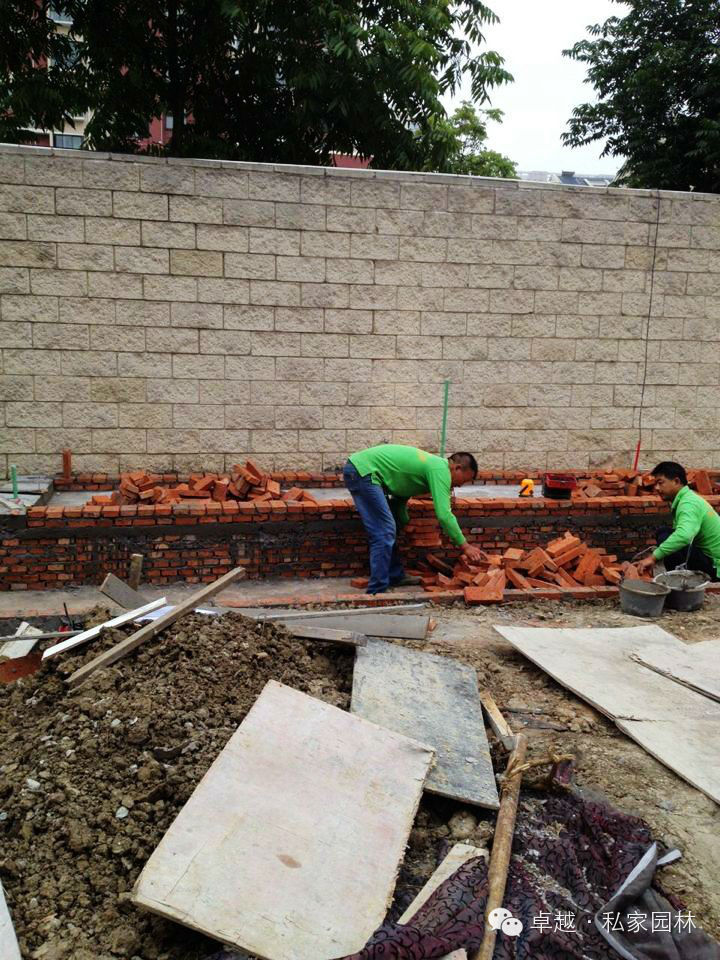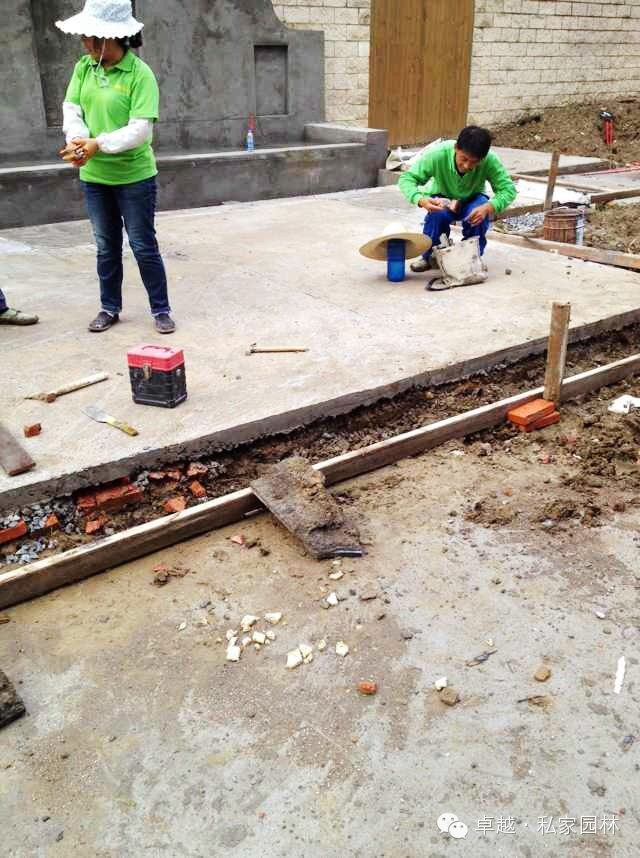 蓝墅工地浇防腐木平台,制作景墙。